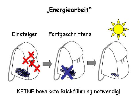 • Wenn Du Dich systematisch ausbilden lässt, lernst Du gezieltere Aktionen kennen und – falls Du so weit gehen willst – auch solche, die es erlauben, inaktiv gewordene Energien (im Modell blau dargestellt) aus dem Rucksack zu entfernen. Dies hat dann eine zusätzlich vorbeugende Wirkung (Prophylaxe), da die bereits entfernten Energien nicht mehr aktiviert werden können und Dich somit nicht mehr belasten werden. Dazu braucht es aber sehr viel Arbeit und ein systematisches Training für fehlerlosen Gebrauch fortgeschrittener Methoden.
